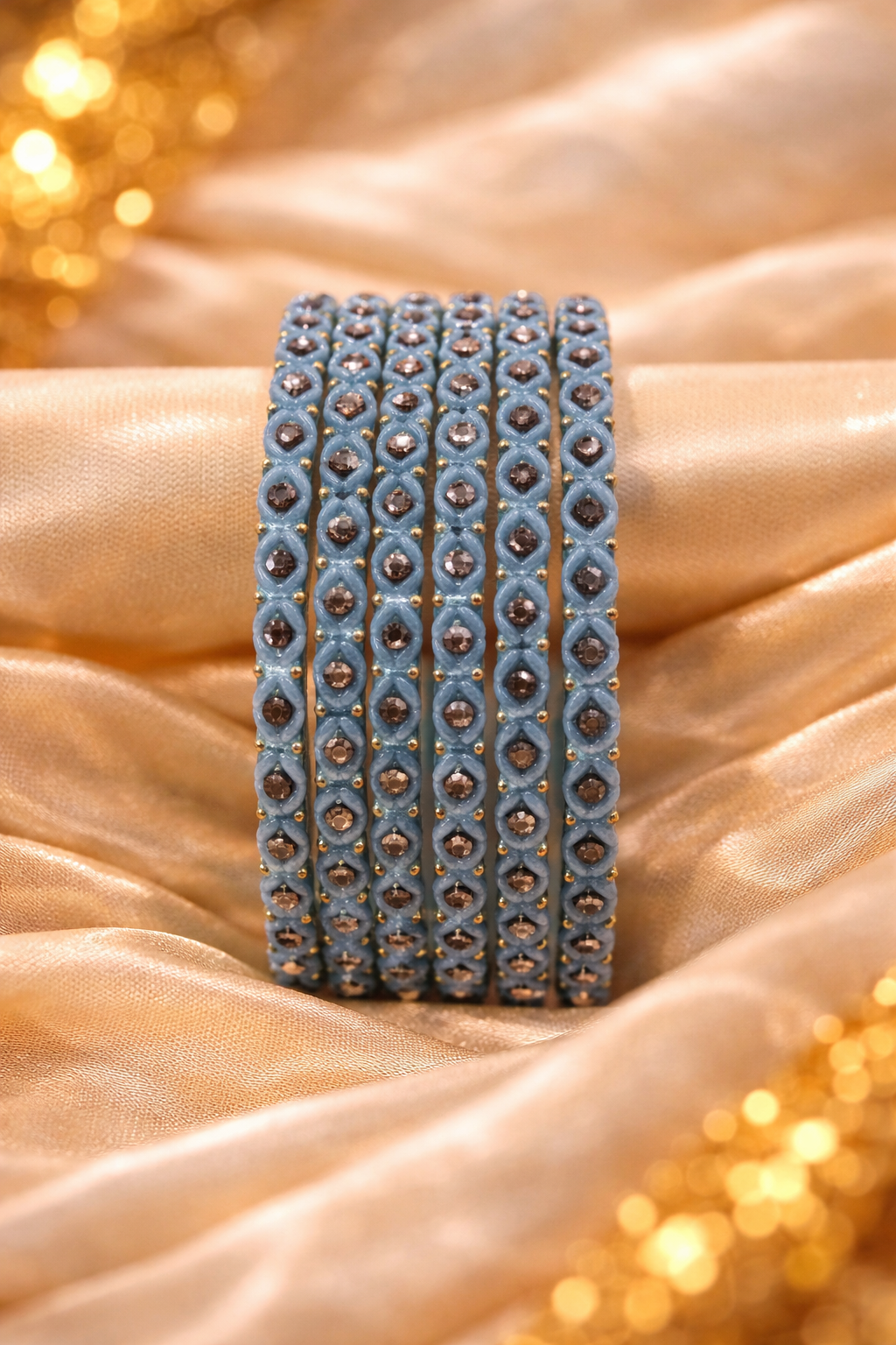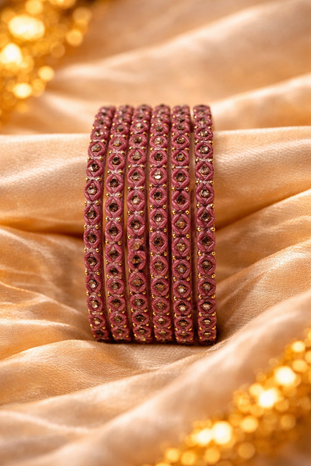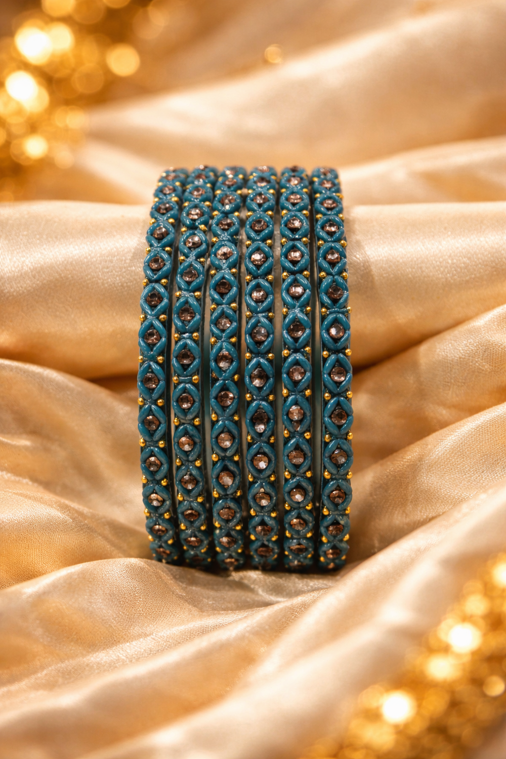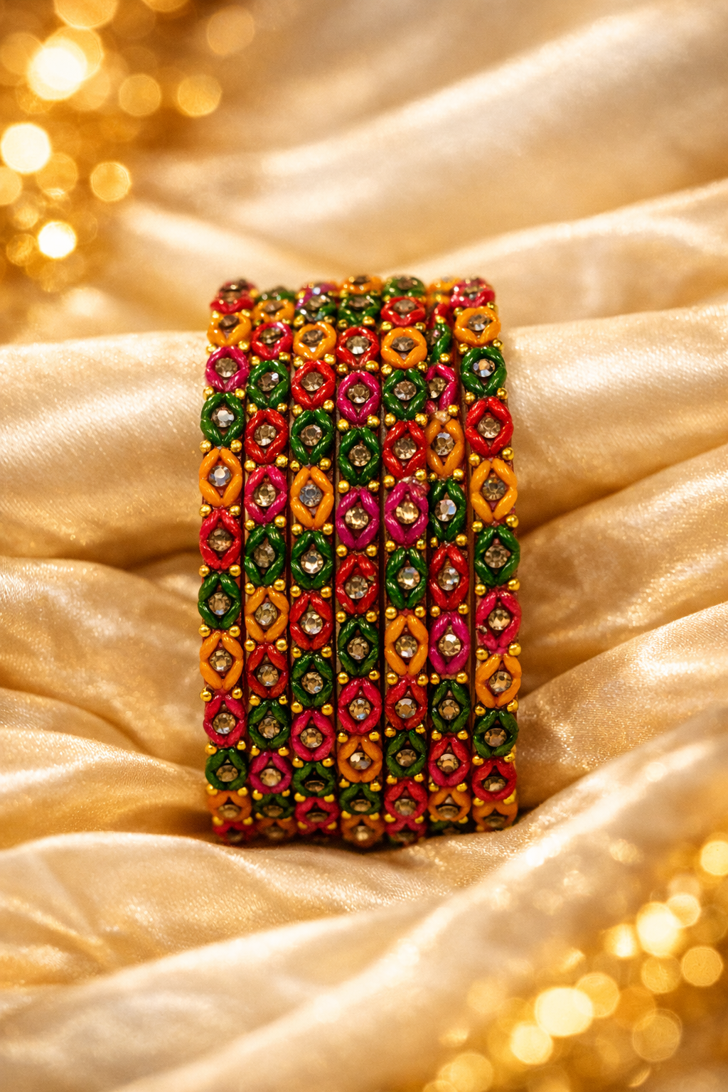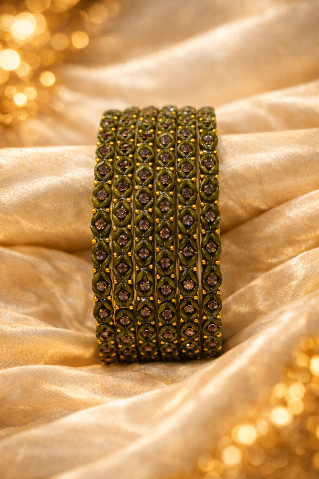 The classic mormukhut green shade symbolizes tradition and richness, making these bangles a perfect choice for weddings, festive celebrations, and cultural occasions. Their balanced shine and detailed craftsmanship allow them to pair effortlessly with bridal wear, ethnic outfits, and festive ensembles. Elegant and timeless, these bangles add a royal touch and traditional charm to every look.
