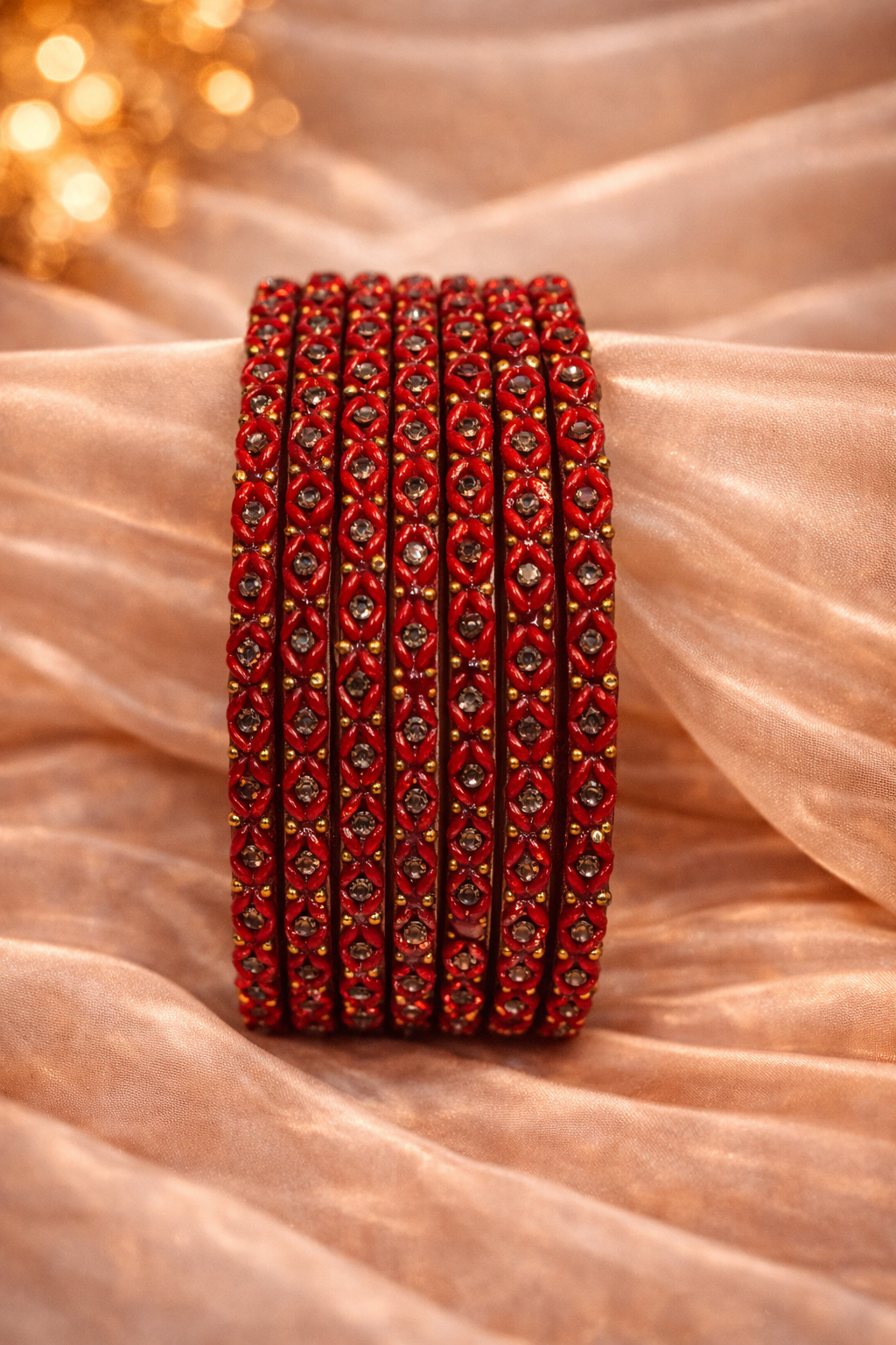 These Mormukhut glass bangles are beautifully crafted with intricate detailing inspired by traditional patterns. The deep green glass base is highlighted with neatly embedded stones and delicate golden bead accents, creating a rich textured look. The slim, layered rows give the bangles a refined structure while maintaining a graceful and elegant finish.